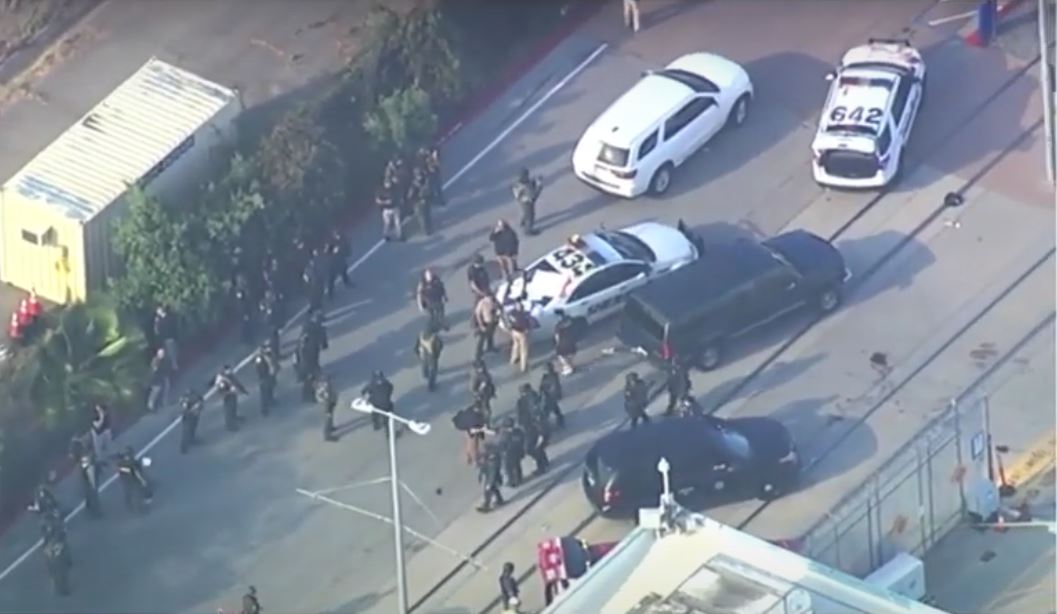 Los vehículos de la policía y la cinta naranja para la escena del crimen bloquearon la zona donde se produjo el tiroteo, y los periodistas se mantuvieron a distancia El patio de ferrocarril está en el barrio administrativo de la ciudad, cerca de la oficina del sheriff y de las oficinas de la ciudad y del condado.