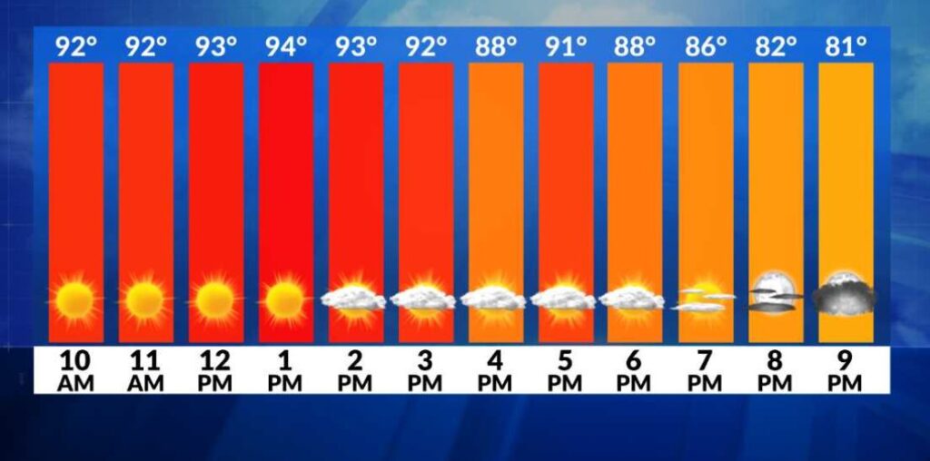 El calor abrasador, húmedo y bochornoso del verano continúa hoy. De hecho, va a ser incluso un poco más caliente de lo que era ayer, con máximas que suben a mediados de los 90 lejos de la costa y se sienten como las temperaturas que suben a 100-105F