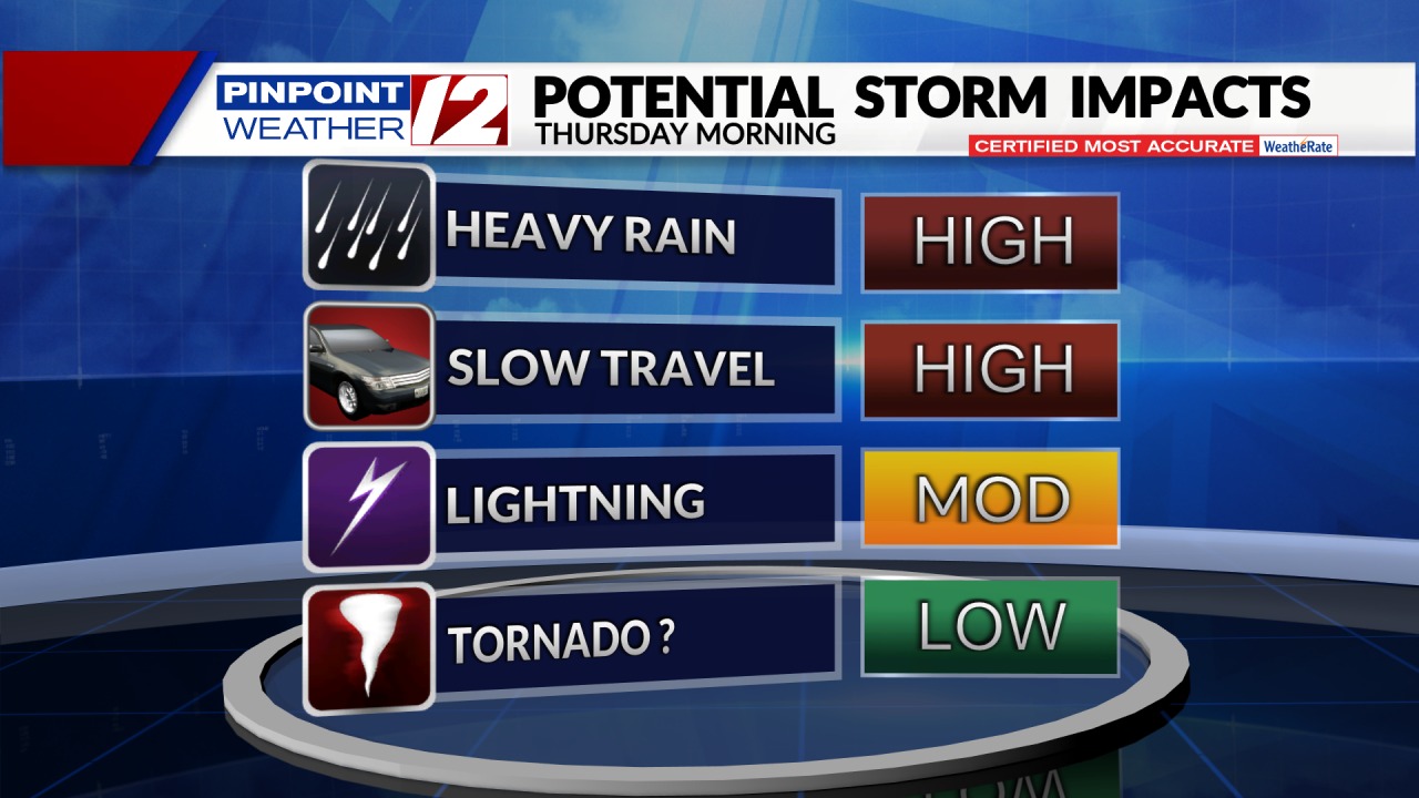 Tendremos que vigilar de cerca las tormentas eléctricas ya que algunas pueden tener rotación dentro de ellas…… lo que a su vez traerá un bajo riesgo de un breve tornado aislado. Aunque el riesgo es pequeño, es ciertamente algo que debemos vigilar y tener en cuenta el jueves por la mañana
