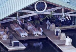 Las imágenes publicadas por el sitio de chismes de celebridades TMZ antes de la boda mostraron que los asientos para la cena estaban dispuestos en lo que parecía ser un gran muelle cubierto, con una lancha de tamaño sustancial para pirotecnia flotando cerca.