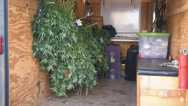 Múltiples plantas de marihuana colgaron en un remolque el domingo después de ser confiscadas por agentes federales durante una redada matutina en una casa de la Avenida Maywood.