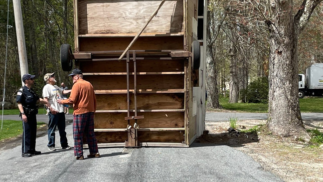 FREETOWN, Massachusetts (WJAR) – La policía de Freetown dijo que un cobertizo casero con ruedas fue abandonado en medio de la carretera. Se había volcado en un extremo, con sus ruedas hacia fuera.