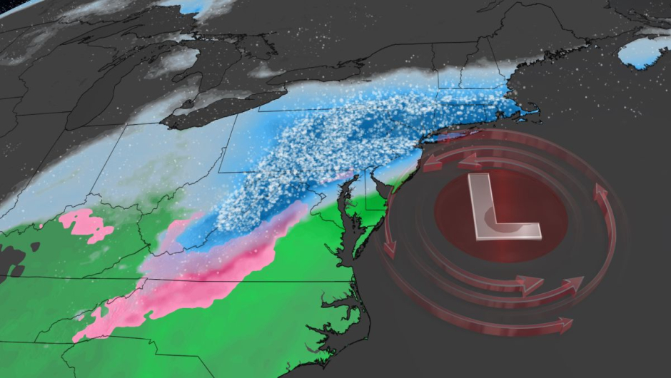 Una mezcla de precipitaciones se extenderá desde Carolina del Norte hasta Pensilvania, con fuertes nevadas en todo el área de los tres estados y Nueva Inglaterra, según muestran los mapas del Centro de Predicción del Tiempo.