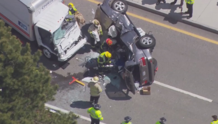 Un Toyota Land Cruiser cruzó la mediana y golpeó de frente a un camión de caja Isuzu.