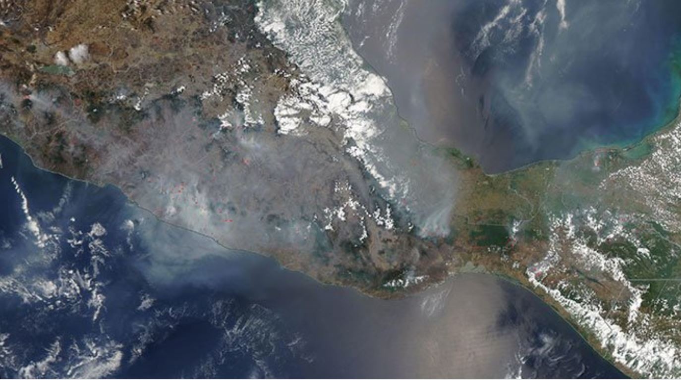 La NASA ha publicado una imagen tomada desde el espacio para mostrar la densa contaminación del aire ocasionada por la ola de incendios que afecta el sur de México. La fotografía fue captada este domingo por el espectrorradiómetro de imágenes de resolución moderada (MODIS, por sus siglas en inglés) a bordo del satélite Aqua.