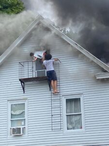 El vídeo y las fotos del incendio muestran a dos niños saliendo por una ventana mientras el fuego y el humo se extendían hacia el cielo. Se puede ver a los bomberos subiendo al techo del segundo piso para ayudarlos.