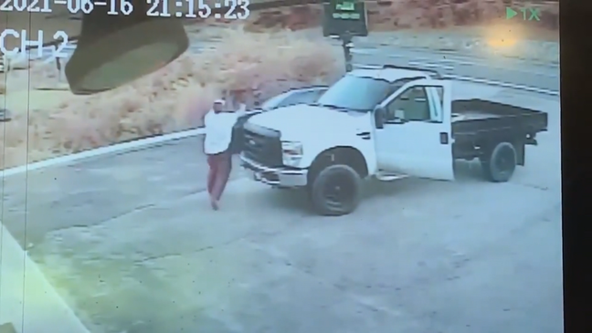 El vídeo de seguridad obtenido por NBC 10 News muestra un coche entrando en el aparcamiento de Wicked Good Pizza en la Ruta 3, seguido por un camión blanco.