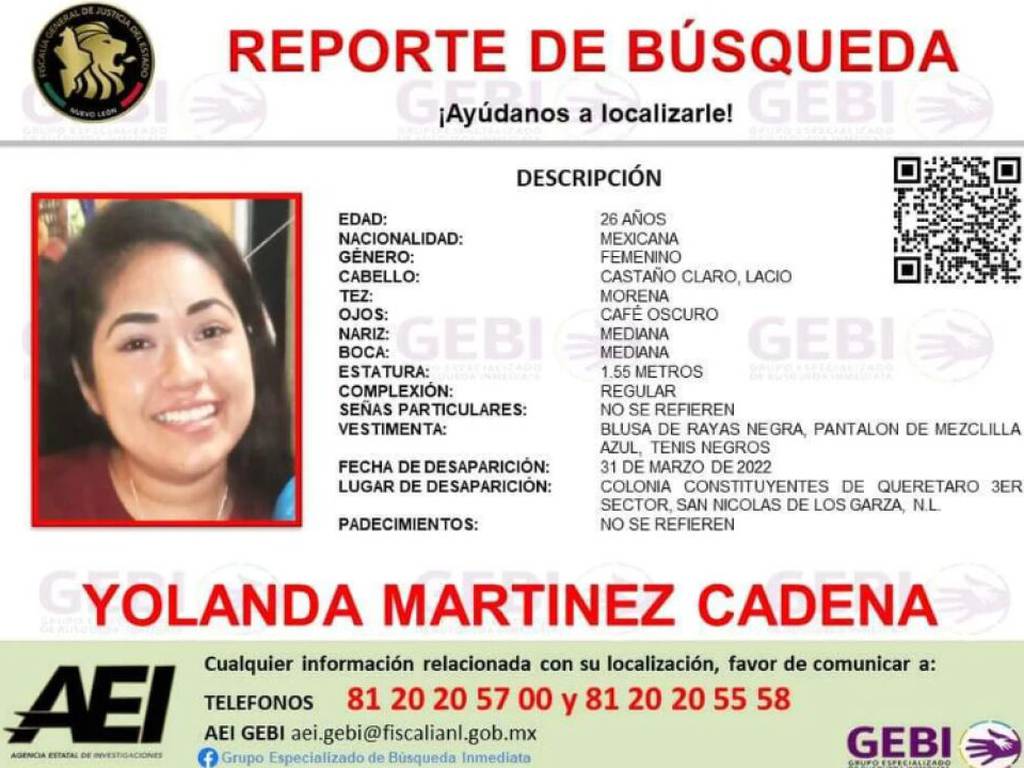 Me ayudan a compartir la ficha de Yolanda Martínez Cadena, está desaparecida desde el día 31 de marzo ,vista por última vez en la colonia Constituyentes de Querétaro, en San Nicolás, Nuevo León. Su papá se llama Gerardo y no a tenido tanto acceso a difusión de la ficha de su hija pic.twitter.com/BvFdcm3ZWy
