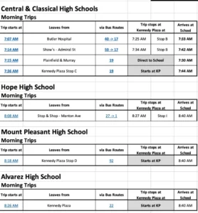 Los estudiantes pueden viajar en cualquier autobús de ruta fija de RIPTA disponible hasta Kennedy Plaza y luego transferir a una ruta de autobús que sirve a su escuela cuando su ruta no está disponible.