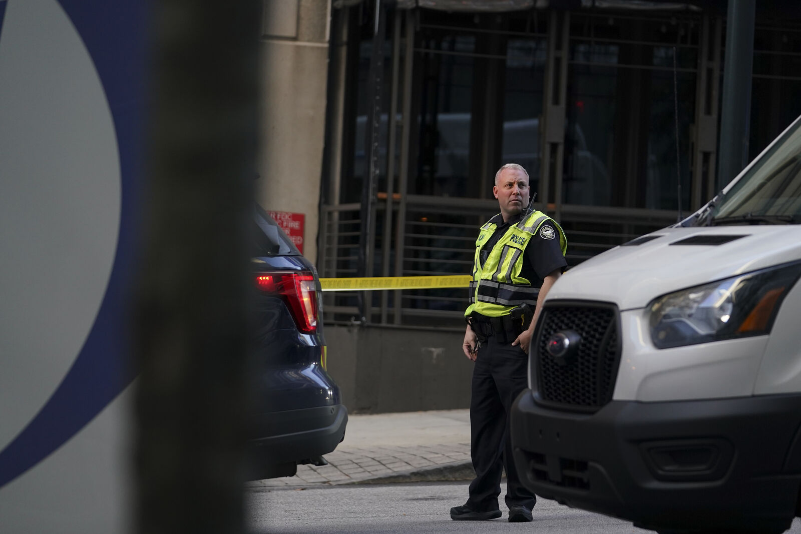 A police officer stands near the entrance of a residential building, Wednesday, Oct. 20, 2021, in Atlanta. Police in Atlanta have closed streets around at least four square blocks of office and apartment buildings in response to gunfire in the city's midtown area. (AP Photo/Brynn Anderson)