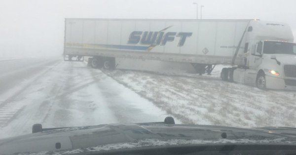 “We have 100% snowpacked & iced roads with drifting. Winds are near 45 to 50 at times. There are many slide offs. We have jackknifed semi’s in Gove, Ellis and Russell Counties!”